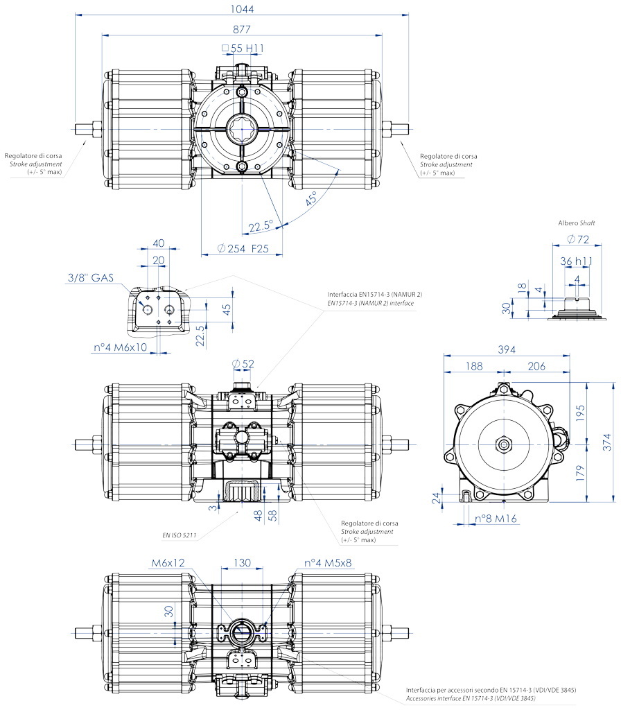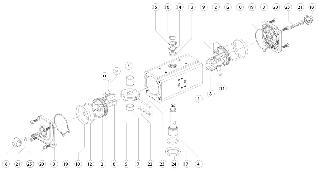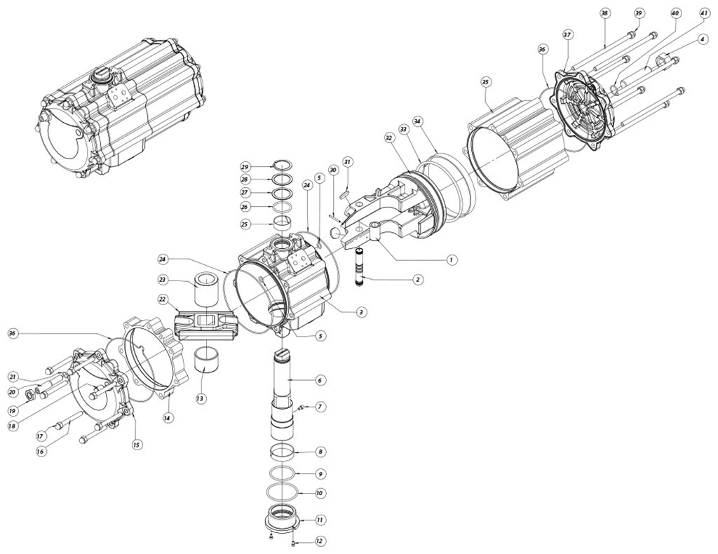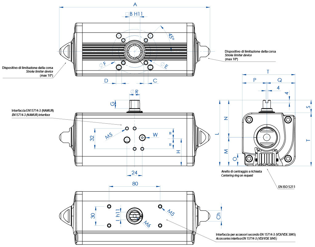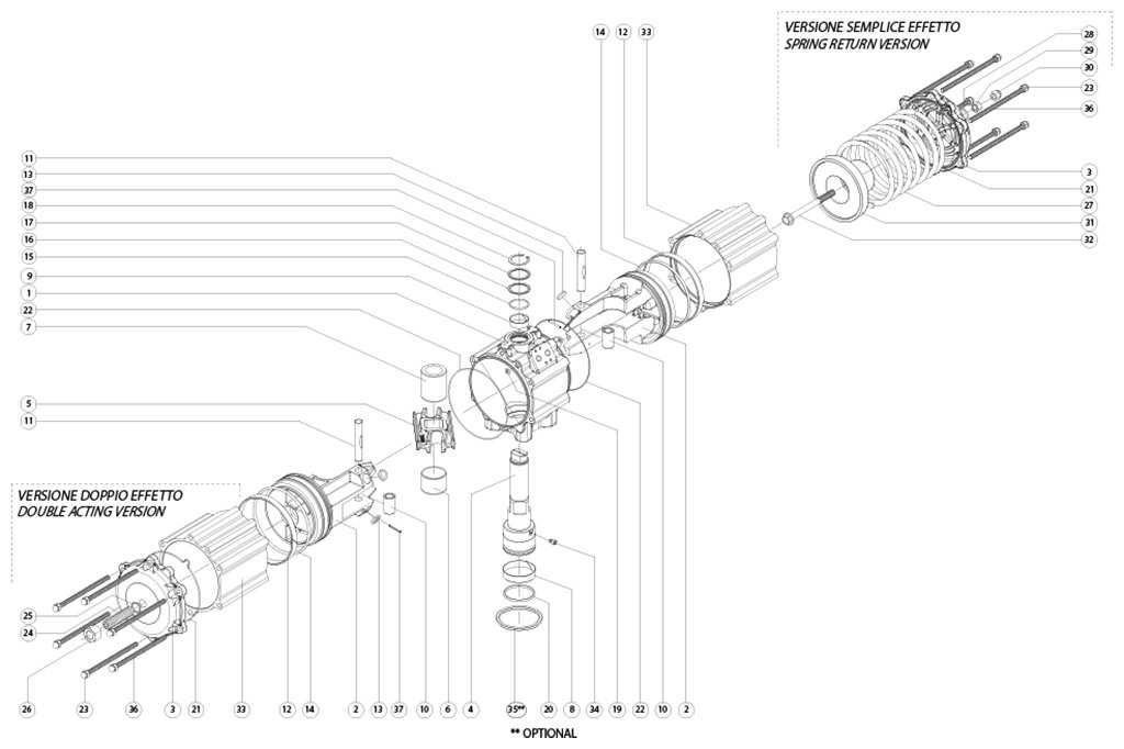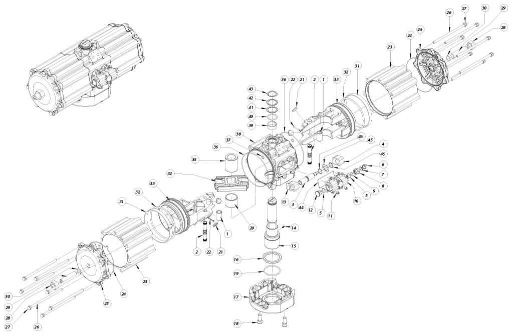 AGO - 铝制执行器 AGO HANDWHEEL - 带侧装一体化手轮执行器 AGO CF8M - CF8M铸造执行器 AGO 316 - 316锻造执行器 AGO A105 - A105碳钢执行器 AGO TWO STAGE - 两段式铝制气动执行器 AGO - 根据要求提供特殊版本 HEAVY DUTY的碳钢执行器 RACKON - 齿轮齿条式气动执行器 下载 总目录 下载 Actuator Accessories Catalogue 解码MAGNUM & THOR 配置您的产品 下载不同格式的2D和3D文件 下载 下载销售条款 宏 气动执行器 小类 AGO - 铝制执行器 选择尺寸 申请详细信息 打印页面 下载目录 AGO - 铝制执行器 优点 特性 特性 物料 图表和起动扭矩 规格 附件 文档 1.自润滑的密封滑动轴承降低活塞与缸筒之间的摩擦力;即便长期停用,亦可避免密封件与缸筒发生粘连。2.缸筒、套管和传动轴的硬度超过50 HRC更强的执行器内部抗力3.缸筒和活塞之间的滚动摩擦更小的摩擦力4.滚动摩擦的十字滑块(通过活塞和无传动装置的轴,将线性运动转换为旋转运动)。活塞和传动轴之间的摩擦力更小,从而减少零部件磨损打开和关闭时有着更强的起动扭矩相较于齿轮和齿条式执行器,其尺寸更小,安装空间需求更低相较于齿轮和齿条式执行器,其重量更小(-30% Kg/Nm),建造基础设施时可降低成本相较于齿轮和齿条式执行器,其耗气量更低,(双效:-40% 空气 cm³/Nm;单效:-20% 空气 cm³/Nm),能够有效降低压缩机的工作负荷,或直接使用小尺寸压缩机。5.滑动缸筒得益于较低的表面粗糙度(0.15μRa),可以降低轴承的磨耗。自DAN15型号起接埠NAMUR电磁阀的接口无需安装额外基座在OMAL自有设施内完成全部生产流程对加工各个阶段的最佳管控ATEX认证可安装于潜在易爆的环境内最高达SIL3等级的认证更高的运行安全等级 技术参数扭矩介于8Nm~8000Nm之间。法兰接口标准:EN ISO 5211F03 - F04 - F05 - F07 - F10 - F12 - F14 - F16 - F25.符合15714-3标准旋转角度:92°(-1°,+91°)起动扭矩:与供应压力成正比;具体请参见表格。对于任意一台执行器,DA后的数字即对应于压力为5.6bar时的起动扭矩(Nm)。ATEX认证型号符合欧盟《2014/34/UE》ATEX防爆条例。*ATEX型号的代码末尾处添加“YX”运行条件温度:-20℃~+80℃。(特殊型号:高温=-20℃~+150℃;低温=-50℃~+60℃)额定压力:5.6bar;最高作业压力:8.4bar (DA8000为7bar)。流体源:无需润滑且经过滤的压缩空气。需要润滑时,请使用与NBR材质相兼容的油料。 DA08 DAN15 - DAN1920 DA2880 DA3840 DA5760 DA8000 DA08(Nm)双效执行器 技术参数表 DA08 (Nm)代码DA008401S重量 [Kg]0,29供气量 [dm3/cycle]0,034密封件KGDI0010 DAN15(Nm)至DAN1920(Nm)的双效执行器 技术参数表 DAN15(Nm)至DAN60(Nm)代码DAN0015411SDAN0015412SDAN0030411SDAN0030412SDAN0045411SDAN0045412SDAN0060411SDAN0060412S密封件KGGI0012KGGI0014KGGI0015KGGI0016尺寸DAN15DAN30DAN45DAN60ISOF03F04F03/F05F04F04F03/F05F04F05/F07A159,1159,1174,3174,3188,5188,5198,1198,1B1111111111111414C x depthM5x8M5x8M5x8M5x8M5x8M5x8M5x8M6x9D x depth--M6x9--M6x9-M8x12E3642364242364250F--50--50-70G1010101013131313H26,826,830,330,332,532,535,735,7I889910101010L72,272,279,279,284,584,590,490,4M282831,531,534,534,537,737,7N44,244,247,747,7505052,752,7O13,213,213,213,213,213,216,516,5P24,224,227,727,7303032,732,7Q282831,531,534,534,537,737,7R9,29,210,910,912,712,714,514,5S2020202020202020T52,252,259,259,264,564,570,470,4W (Gas)1/8”1/8”1/8”1/8”1/8”1/8”1/8”1/8”Ch1313131313131313Weight (Kg)0,750,75111,21,21,61,6Air (dm3/cycle)0,080,080,150,150,220,220,30,3H = 固定板中心 技术参数表 DAN106(Nm)至DAN720(Nm)代码DAN0106411SDAN0120411SDAN0180411SDAN0240411SDAN0360411SDAN0480411SDAN0720411S密封件KGGI0060KGGI0018KGGI0019KGGI0020KGGI0021KGGI0022KGGI0023尺寸DAN106DAN120DAN180DAN240DAN360DAN480DAN720ISOF05/F07F05/F07F07/F10F07/F10F07/F10F10/F12F10/F12A237,1257,4289,9313,6339,3387,7433B17172222222727C x depthM6x9M6x9M8x12M8x12M8x12M10x15M10x15D x depthM8x12M8x12M10x15M10x15M10x15M12x18M12x18E5050707070102102F7070102102102125125G13131617191919,5H42,844,854,558,16057,461,5I12121515191922L103,3107137,5141,1148164,9178M44,846,856,560,16272,978,5N58,560,28181869299,5O19,319,324,824,824,329,529,5P38,540,25151566269,5Q44,846,856,560,16272,978,5R16,21820,222,525,52931,8S20203030303030T83,387107,5111,1118134,9148W (气体)1/8"1/8"1/8"1/8"1/8"1/4"1/4"Ch17172222222727重量 (Kg)2,52,64,65,46,59,612供气量(dm3/ciclo)0,550,590,951,31,82,63,5H = 固定板中心 技术参数表 DAN106(Nm)至DAN720(Nm)代码DAN0960411SDAN0960412SDAN1440412SDAN1440411SDAN1920412SDAN1920411S密封件KGGI0024KGGI0025KGGI0026尺寸DAN960DAN1440DAN1920ISOF10/F12F14F12F14F12/F16F14A479,4479,4567567601601B363636364646C x depthM10x15M16x24M12x18M16x24M12x18M16x24D x depthM12x18---M20x30-E102140125140125140F125---165-G19,519,519,519,518,518,5H787886,586,599,299,2I242427273232L198198216216237,7237,7M93,593,5101,5101,5114,7114,7N104,5104,5114,5114,5123123O38,538,538,538,548,548,5P74,574,584,584,59393Q93,593,5101,5101,5114,7114,7R36,536,541414646S303030303030T168168186186207,7207,7W (气体)1/4"1/4"1/4"1/4"1/4"1/4"Ch272736363636重量(Kg)17,417,423,423,43232供气量 (dm3/cycle)4,94,97,67,610,210,2H = 固定板中心 DA2880(Nm)双效气动执行器 技术参数表 DA 2880 (Nm)代码DA2880E16D0A重量 [Kg]55,4供气量 [dm3/cycle]20密封备件KGDI1035 DA3840(Nm)双效气动执行器 技术参数表 DA3840 (Nm)代码DA3840E1600A重量 [Kg]49供气量 [dm3/cycle]25,6密封备件KGDI0030 DA5760(Nm)双效气动执行器 技术参数表 DA 5760 (Nm)代码DA5760E25D0A重量 [Kg]85,5供气量 [dm3/cycle]38,0密封备件KGDI2035 DA8000(Nm)双效气动执行器 技术参数表 DA 8000 (Nm)代码DA8000E25D0A重量 [Kg]105,5供气量 [dm3/cycle]50密封备件KGDI1040 DA08 DAN15 - DAN1920 DA2880 DA3840 DA5760 DA8000 下述尺寸的双效气动执行器组件:DA8 下述尺寸的双效气动执行器