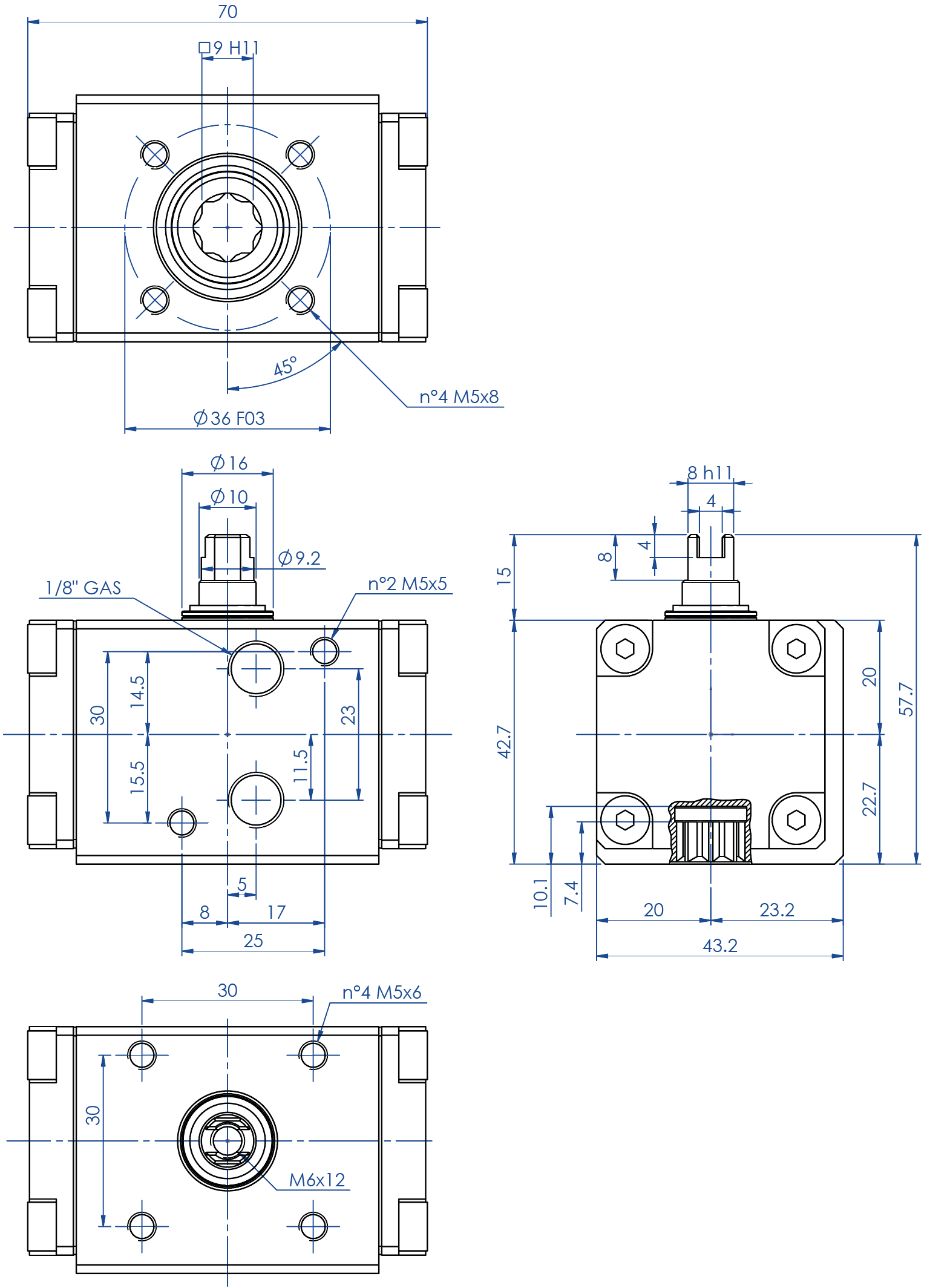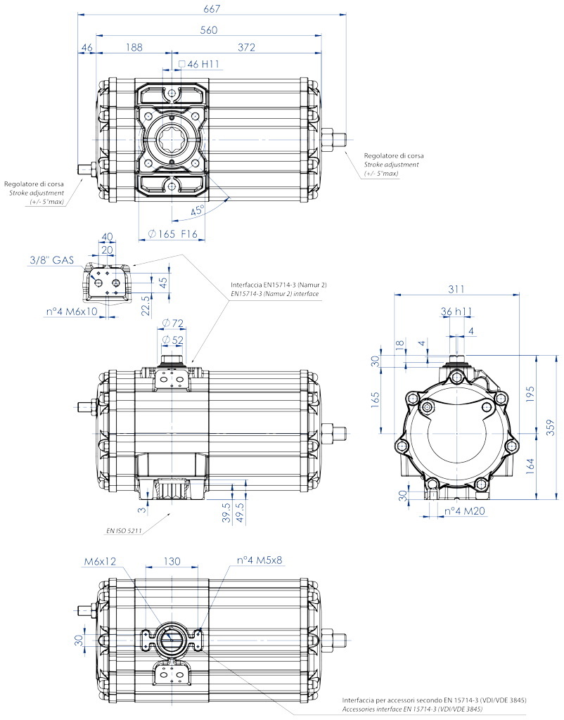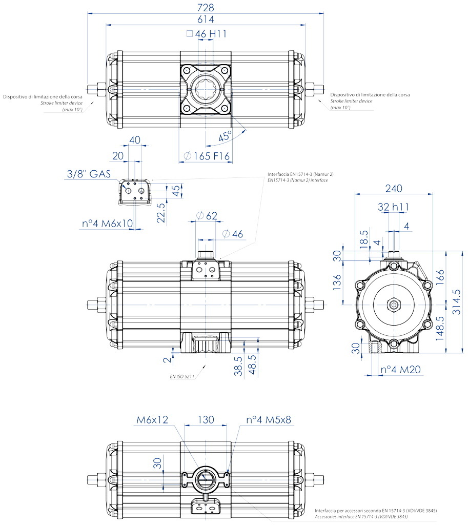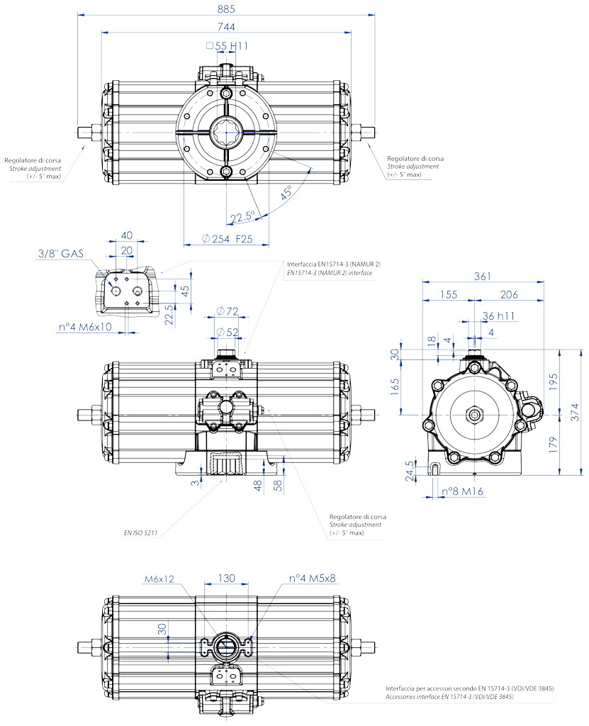 AGO - 铝制执行器 AGO HANDWHEEL - 带侧装一体化手轮执行器 AGO CF8M - CF8M铸造执行器 AGO 316 - 316锻造执行器 AGO A105 - A105碳钢执行器 AGO TWO STAGE - 两段式铝制气动执行器 AGO - 根据要求提供特殊版本 HEAVY DUTY的碳钢执行器 RACKON - 齿轮齿条式气动执行器 下载 总目录 下载 Actuator Accessories Catalogue 解码MAGNUM & THOR 配置您的产品 下载不同格式的2D和3D文件 下载 下载销售条款 宏 气动执行器 小类 AGO - 铝制执行器 选择尺寸 申请详细信息 打印页面 下载目录 AGO - 铝制执行器 优点 特性 特性 物料 图表和起动扭矩 规格 附件 文档 1.自润滑的密封滑动轴承降低活塞与缸筒之间的摩擦力;即便长期停用,亦可避免密封件与缸筒发生粘连。2.缸筒、套管和传动轴的硬度超过50 HRC更强的执行器内部抗力3.缸筒和活塞之间的滚动摩擦更小的摩擦力4.滚动摩擦的十字滑块(通过活塞和无传动装置的轴,将线性运动转换为旋转运动)。活塞和传动轴之间的摩擦力更小,从而减少零部件磨损打开和关闭时有着更强的起动扭矩相较于齿轮和齿条式执行器,其尺寸更小,安装空间需求更低相较于齿轮和齿条式执行器,其重量更小(-30% Kg/Nm),建造基础设施时可降低成本相较于齿轮和齿条式执行器,其耗气量更低,(双效:-40% 空气 cm³/Nm;单效:-20% 空气 cm³/Nm),能够有效降低压缩机的工作负荷,或直接使用小尺寸压缩机。5.滑动缸筒得益于较低的表面粗糙度(0.15μRa),可以降低轴承的磨耗。自DAN15型号起接埠NAMUR电磁阀的接口无需安装额外基座在OMAL自有设施内完成全部生产流程对加工各个阶段的最佳管控ATEX认证可安装于潜在易爆的环境内最高达SIL3等级的认证更高的运行安全等级 技术参数扭矩介于8Nm~8000Nm之间。法兰接口标准:EN ISO 5211F03 - F04 - F05 - F07 - F10 - F12 - F14 - F16 - F25.符合15714-3标准旋转角度:92°(-1°,+91°)起动扭矩:与供应压力成正比;具体请参见表格。对于任意一台执行器,DA后的数字即对应于压力为5.6bar时的起动扭矩(Nm)。ATEX认证型号符合欧盟《2014/34/UE》ATEX防爆条例。*ATEX型号的代码末尾处添加“YX”运行条件温度:-20℃~+80℃。(特殊型号:高温=-20℃~+150℃;低温=-50℃~+60℃)额定压力:5.6bar;最高作业压力:8.4bar (DA8000为7bar)。流体源:无需润滑且经过滤的压缩空气。需要润滑时,请使用与NBR材质相兼容的油料。 DA08 DAN15 - DAN1920 DA2880 DA3840 DA5760 DA8000 DA08(Nm)双效执行器 技术参数表 DA08 (Nm)代码DA008401S重量 [Kg]0,29供气量 [dm3/cycle]0,034密封件KGDI0010 DAN15(Nm)至DAN1920(Nm)的双效执行器 技术参数表 DAN15(Nm)至DAN60(Nm)代码DAN0015411SDAN0015412SDAN0030411SDAN0030412SDAN0045411SDAN0045412SDAN0060411SDAN0060412S密封件KGGI0012KGGI0014KGGI0015KGGI0016尺寸DAN15DAN30DAN45DAN60ISOF03F04F03/F05F04F04F03/F05F04F05/F07A159,1159,1174,3174,3188,5188,5198,1198,1B1111111111111414C x depthM5x8M5x8M5x8M5x8M5x8M5x8M5x8M6x9D x depth--M6x9--M6x9-M8x12E3642364242364250F--50--50-70G1010101013131313H26,826,830,330,332,532,535,735,7I889910101010L72,272,279,279,284,584,590,490,4M282831,531,534,534,537,737,7N44,244,247,747,7505052,752,7O13,213,213,213,213,213,216,516,5P24,224,227,727,7303032,732,7Q282831,531,534,534,537,737,7R9,29,210,910,912,712,714,514,5S2020202020202020T52,252,259,259,264,564,570,470,4W (Gas)1/8”1/8”1/8”1/8”1/8”1/8”1/8”1/8”Ch1313131313131313Weight (Kg)0,750,75111,21,21,61,6Air (dm3/cycle)0,080,080,150,150,220,220,30,3H = 固定板中心 技术参数表 DAN106(Nm)至DAN720(Nm)代码DAN0106411SDAN0120411SDAN0180411SDAN0240411SDAN0360411SDAN0480411SDAN0720411S密封件KGGI0060KGGI0018KGGI0019KGGI0020KGGI0021KGGI0022KGGI0023尺寸DAN106DAN120DAN180DAN240DAN360DAN480DAN720ISOF05/F07F05/F07F07/F10F07/F10F07/F10F10/F12F10/F12A237,1257,4289,9313,6339,3387,7433B17172222222727C x depthM6x9M6x9M8x12M8x12M8x12M10x15M10x15D x depthM8x12M8x12M10x15M10x15M10x15M12x18M12x18E5050707070102102F7070102102102125125G13131617191919,5H42,844,854,558,16057,461,5I12121515191922L103,3107137,5141,1148164,9178M44,846,856,560,16272,978,5N58,560,28181869299,5O19,319,324,824,824,329,529,5P38,540,25151566269,5Q44,846,856,560,16272,978,5R16,21820,222,525,52931,8S20203030303030T83,387107,5111,1118134,9148W (气体)1/8"1/8"1/8"1/8"1/8"1/4"1/4"Ch17172222222727重量 (Kg)2,52,64,65,46,59,612供气量(dm3/ciclo)0,550,590,951,31,82,63,5H = 固定板中心 技术参数表 DAN106(Nm)至DAN720(Nm)代码DAN0960411SDAN0960412SDAN1440412SDAN1440411SDAN1920412SDAN1920411S密封件KGGI0024KGGI0025KGGI0026尺寸DAN960DAN1440DAN1920ISOF10/F12F14F12F14F12/F16F14A479,4479,4567567601601B363636364646C x depthM10x15M16x24M12x18M16x24M12x18M16x24D x depthM12x18---M20x30-E102140125140125140F125---165-G19,519,519,519,518,518,5H787886,586,599,299,2I242427273232L198198216216237,7237,7M93,593,5101,5101,5114,7114,7N104,5104,5114,5114,5123123O38,538,538,538,548,548,5P74,574,584,584,59393Q93,593,5101,5101,5114,7114,7R36,536,541414646S303030303030T168168186186207,7207,7W (气体)1/4"1/4"1/4"1/4"1/4"1/4"Ch272736363636重量(Kg)17,417,423,423,43232供气量 (dm3/cycle)4,94,97,67,610,210,2H = 固定板中心 DA2880(Nm)双效气动执行器 技术参数表 DA 2880 (Nm)代码DA2880E16D0A重量 [Kg]55,4供气量 [dm3/cycle]20密封备件KGDI1035 DA3840(Nm)双效气动执行器 技术参数表 DA3840 (Nm)代码DA3840E1600A重量 [Kg]49供气量 [dm3/cycle]25,6密封备件KGDI0030 DA5760(Nm)双效气动执行器 技术参数表 DA 5760 (Nm)代码DA5760E25D0A重量 [Kg]85,5供气量 [dm3/cycle]38,0密封备件KGDI2035 DA8000(Nm)双效气动执行器 技术参数表 DA 8000 (Nm)代码DA8000E25D0A重量 [Kg]105,5供气量 [dm3/cycle]50密封备件KGDI1040 DA08 DAN15 - DAN1920 DA2880 DA3840 DA5760 DA8000 下述尺寸的双效气动执行器组件:DA8 下述尺寸的双效气动执行器