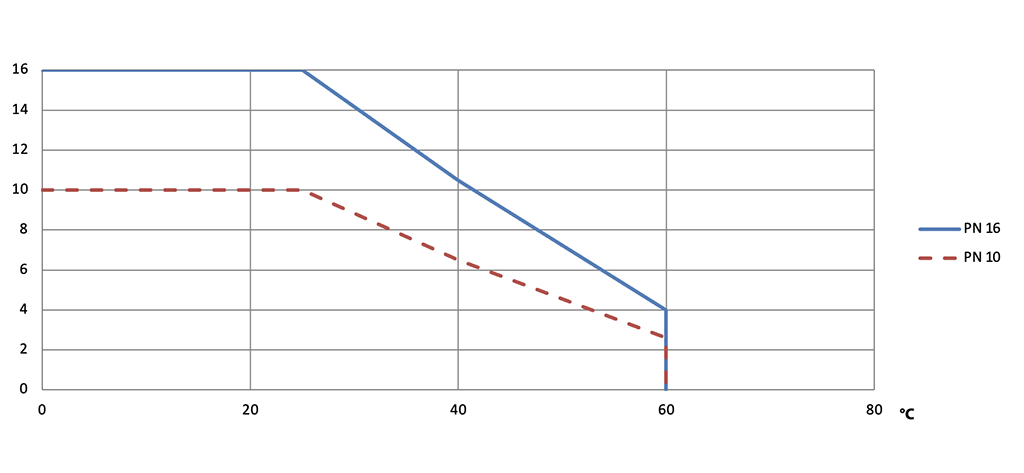 • 若流体兼容粘接工艺接头阀门的化学耐性,PN16可达20℃,PN10适用于螺纹接头。