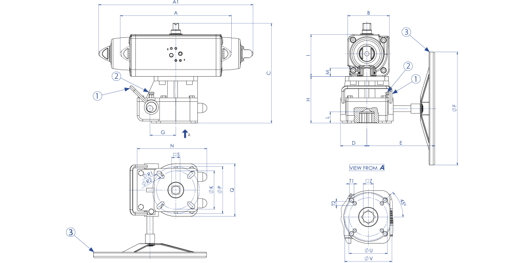安全区 信号盒 外置限位器和位置指示器 定位器 电磁阀和线圈 流量调节器 手轮式手动减速器 渐缩管和消声器滤芯 ATEX 区域 信号盒 外置限位器和位置指示器 定位器 电磁阀和线圈 下载 总目录 下载 Actuator Accessories Catalogue 解码MAGNUM & THOR 配置您的产品 下载不同格式的2D和3D文件 下载 下载销售条款 宏 执行器附件目 小类 安全区 子类 手轮式手动减速器 SEARCH CODE 申请详细信息 下载目录 可断开手轮铝制减速器 主要特性- 检测到故障或缺少流体供应(压缩空气)时,本型操作装置专用于紧急 操纵1/4 圈气动执行器控制的阀门。操作装置安装在阀门和气动执行器 之间。操作装置断开时,执行器可以直接控制阀门。操作装置接入时,可以紧急操纵执行器和阀门的固定销。 此外,当气动执行器因更换或维修而被拆除时,操作装置还可以手动形式操纵阀门。- 防护等级IP65- 工作温度:-20℃~+80℃ 材质- 本体:铝合金†G-AISi10Mg- 带齿旋转:铸件†GJS 400 - 15- 无止螺栓:C45 钢- 主轴:C45 钢- 手轮:S235JR 钢 减速器最大输出扭矩RFDA0B1114280 NmRFDA0B1414280 NmRFDB0D1717270 NmRFDC0F2222530 NmRFDD122727740 Nm 双效/单效执行器上的手轮减速器 断开向外拉动把手(2)同时向上旋转连杆(1),而后释放把手(2)并确保其返回至初始位置(发出咔嗒声),此时,连杆(1)无法被旋转,减速器即断开且手轮(3)空转。 接入接入时需遵照上文所述步骤,但需要将连杆(1)由上至下旋转;此时减速器即已接入,通过手轮(3)即可手动操作。 围度表格减速器 RFDA0B1414 RFDB0D1717 RFDB0D1717 RFDC0F2222 RFDC0F2222RFDC0F2222 RFDD122727RFDD122727 执行器套件 -减速器KCF072623 KCF072623 KCF072623 KCF102726 KCF102726 KCF102726 KCF124042 KCF124042执行器 DAN0060 F05-F07DAN0106 F05-F07DAN0120 F05-F07DAN0180 F07-F10DAN0240 F07-F10 DAN0360 F07-F10DAN0480 F10-F12 DAN0720 F10-F12执行器 SRN0030 F05-F07SRN0053 F05-F07SRN0060 F05-F07SRN0090 F07-F10SRN0120 F07-F10 SRN0180 F07-F10SRN0240 F10-F12 SRN0360 F10-F12A mm.198237244,1289,9313,6339,3387,6 433,1A1 mm.258,8304,2338,5393,7409,6 474520,5 613B mm.70,483,387107,5111,1118134,9 148C mm.190,4221,3 225261,5265,1 272326,9 340D mm.4562,562,5707070 95 95E mm.130150150180180 180300 300ØF mm.200200200400400 400400 400G mm.4452526565 6585 85H mm.100118118124124 124162162I mm.70,483,387107,5111,1118134,9148L mm.16,321,521,526,526,526,529,5 29,5M mm.1417172222 2227 27N mm.125150150185185 185230 230ØK mm.507070102102 102--ØP mm.70102102125125 125125 125Q mm.90125125140140 140190 190ØR1 mm.8,5111112,512,5 12,512,512,5ØR2 mm.6,58,58,510,510,5 10,5--□ S mm.1417172222 2227 27T1 mm.M8M10M10M12M12 M12M12 M12T2 mm.M6M8M8M10M10 M10- -ØU507070102102 102- -ØV70102102125125 125 125125□ Z1417172222 22 27 27确定气动执行器的尺寸时考虑的最低供应压力为5.6 Barg。若压力与标准相异,请联络销售办事处。 围度表格减速器 RRD04EG0EG 0000000381004 RRD06FH0GH 0000000421004 RRD06FH0GH 0000000421004 RRD08HL0HL 0000000351004 RRD08HL0HL 0000000351004RRD08HL0HL 0000000381004 RRD09LM0LM 0000000351004执行器套件 DA-减速器KCF145371 KCF145163 KCF165164 KCF165165 KCF165165KCF255166 KCF255168执行器套件 SR-减速器KCF165165执行器 DAN0960 F10-F12DAN1440 F14DAN1920 F14DA2880 F16DA3840 F16DA5760 F25DA8000 F25执行器 SRN0480 F10-F12SRN0720 F14SRN0960 F14SR1440 F16SR1920 F16SR2880 F16SR4000 F25A mm.223280280447447447433B mm.358410432568523,5568603C mm.306356356444444444461D mm.479,3567,16016677188851044D1 mm.648,279882870897512011371ØE mm.600700700500500600500F mm.85127127162162162183G mm.57626272727261ØH mm.547575909090140I mm.58,379,979,997,497,497,4147,6ØJ mm.102125125165165165254ØK mm.140165165254254254298ØL mm.-------M mm.M10M12M12M20M20M20M16 (N°8)ØN mm.M16M20M20M16 (N°8)M20 (N°8)M16(N°8)M20 (N°8)P mm.-------F/F ISO 5211 F10/F14F12/F16F12/F16F16/F25F16/F25F16/F25F25/F30ØQ mm.75102102130130130180R mm.2776664S mm.699999121121121134MAX STEM HEIGHT mm.66929211311311390Weight (DA) Kg. 397887140144177210Weight (SR) Kg. 40,57887155160210230 SEARCH CODE